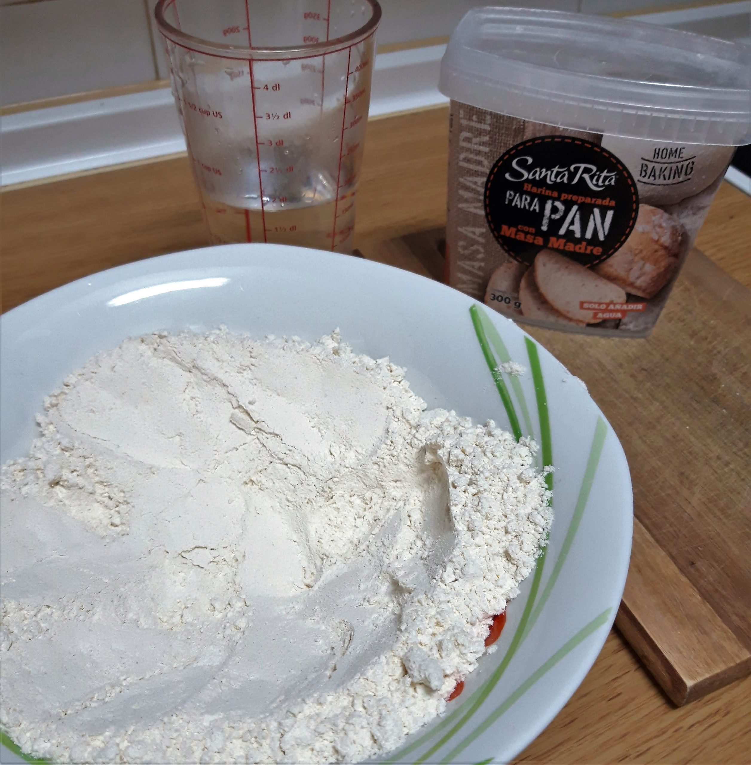 Así que hemos empezado por lo fácil, hacer pan para dummies. ¿Y cómo? Pues con un preparado para hacer pan de Harinas Santa Rita. Simplemente hay que añadirle agua templada y voilà: